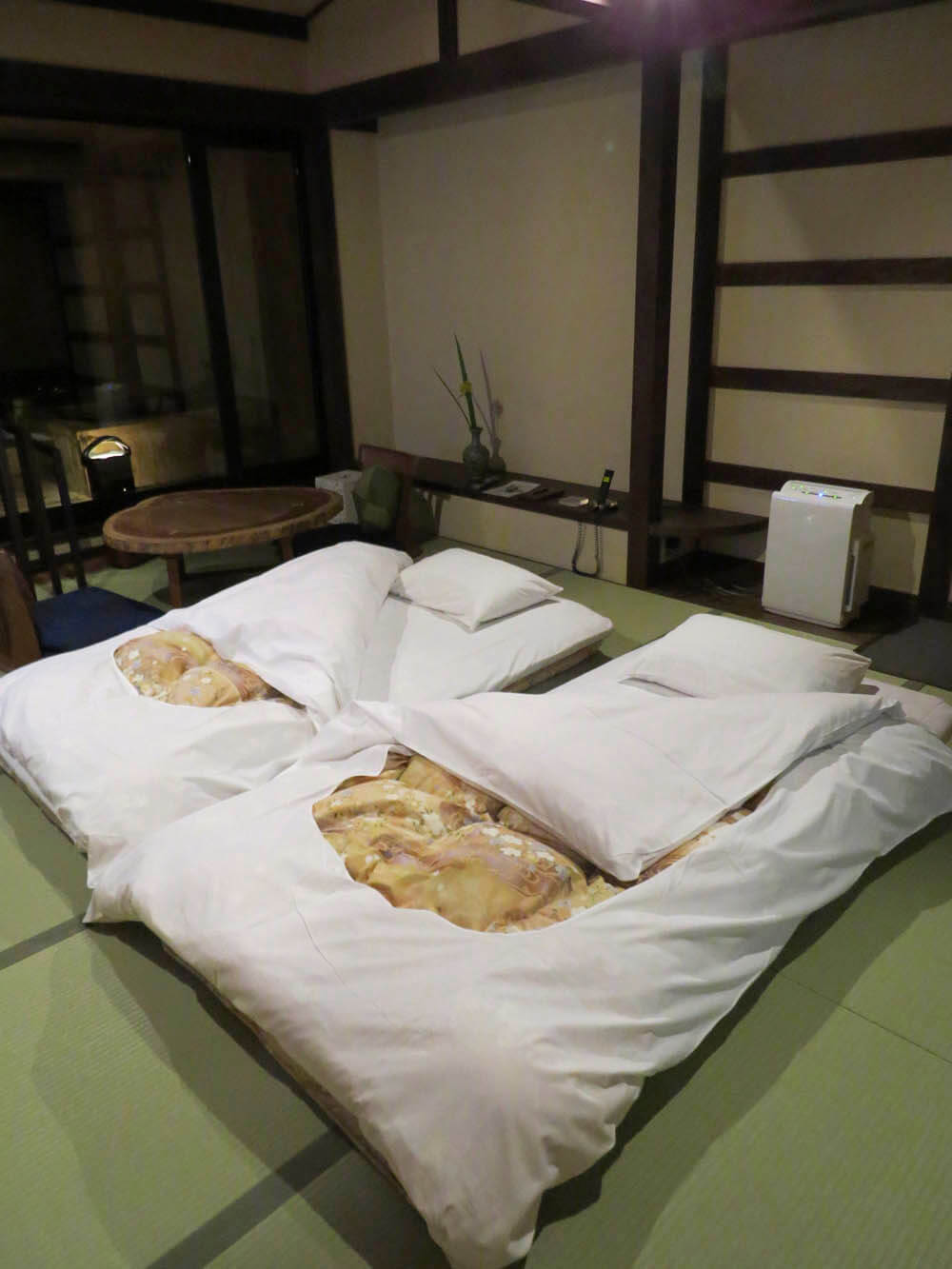 The maid will also put a duvet and a pillow out for you. The duvets are similar to those in the UK, but again, you can ask for extra blankets if you are worried about being cold at night. The pillow is traditionally filled with rice husks, which makes it more like a bean bag than a feather pillow. This can take a bit of getting used to. The best strategy is to shape the pillow to hold your head comfortably, then try to stay still and relaxed. Unlike feather pillows, the pillow does not reshape as you move your head, so the less you move, the better! Some ryokans might have feather or foam pillows you can use instead, but you can always improvise with a travel pillow or a folded jumper if you decide to try a rice pillow and find you can’t get comfy.