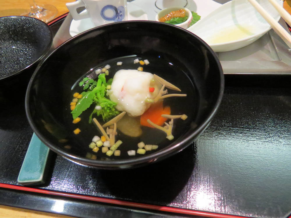 Suimono (soup) – This is usually a clear broth type soup, with tofu, vegetables or seafood pieces inside. Use your chopsticks to eat the solid pieces and drink the soup directly from the bowl.